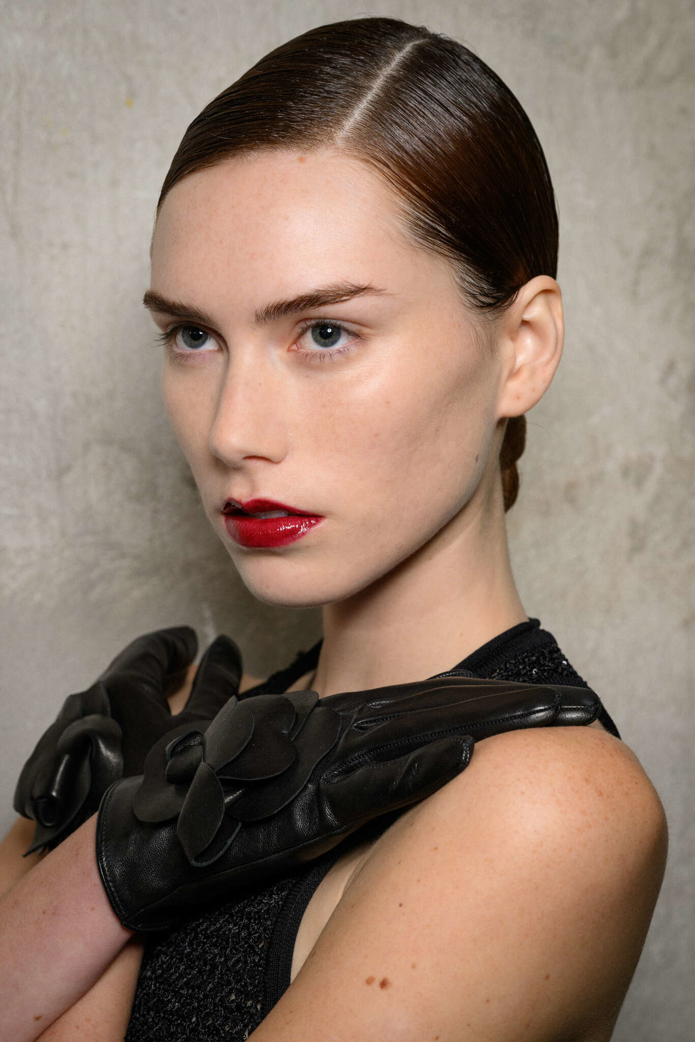 - Черному оттенку, как и классическому красному, не помешает ровный тон лица.